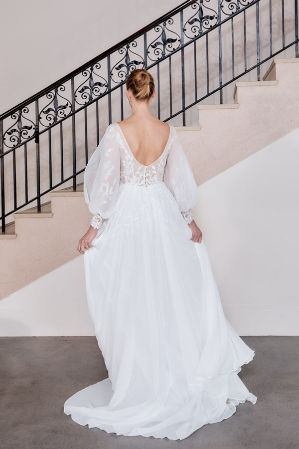 This chiffon A-line gown from Kelsey Rose balances softness with striking texture. A plunge neckline and bodice are adorned with botanical lace, the billowing balloon sleeves flow into lace-trimmed cuffs. The skirt falls from the natural waist into a gentle train, offering movement and lightness in every step.
